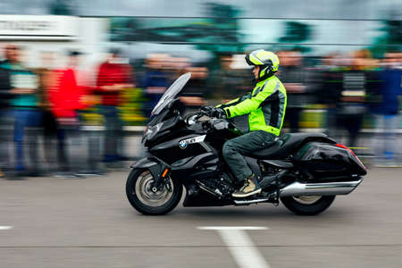 Russia, Moscow, 03.14.2020, a motorcyclist in green uniform rides with high speed on a black motorcycle