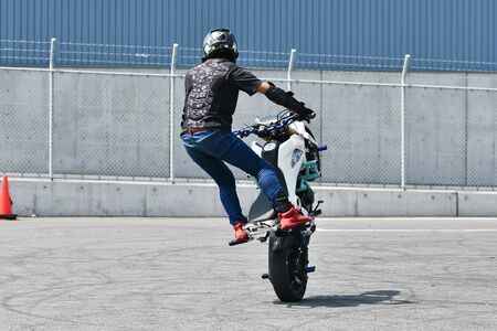 Moscow, Russia - Jul 17, 2020: Moto rider making a stunt on his motorbike. Motorcyclist making stoppie a difficult and dangerous stunt on his motorbike