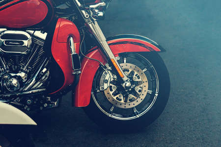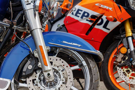 Moscow, Russia - May 04, 2019: Front wheel of Harley Davidson motorcycle closeup on a background of sport bike. Moto festival MosMotoFest 2019