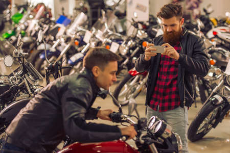 Attractive blond man in black leather jacket is sitting on a motorbike. Handsome young bearded man is making photo