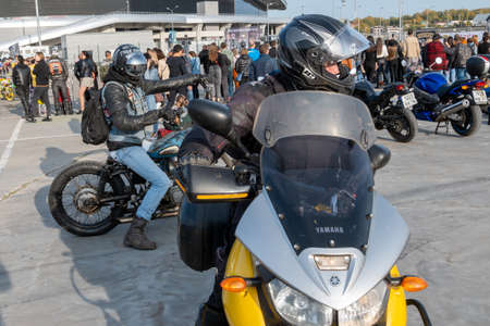 Kazan, Russia-September 26, 2020: Bikers maneuver on their motorcycles in the parking lot at a biker meeting amid people watching the arrival of other bikers.