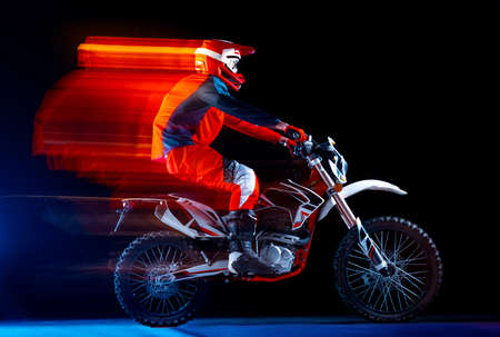 Portrait of young man, biker riding motorbike isolated over black background in neon with mixed lights. Dynamics. Concept of motosport, speed, action, hobby, competition. Copy space for ad