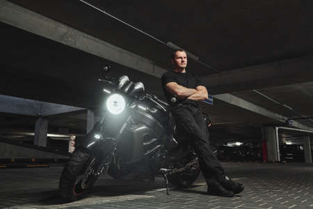 Cropped photo of Caucasian motorcyclist in leather clothes having rest in garage stock photo