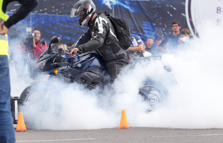 Moscow, Russia - Jul 12, 2020: Moto rider making a stunt on his motorbike. Stunt motorcycle rider performing motorcycle show. Motorcyclist making doing a difficult and dangerous stunt on his motorbike