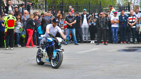 Moto free style pilot on the white and blue motorcycle stunting on the square - Pyatigorsk Russia Opening of moto season 2015 on 1st May 2015