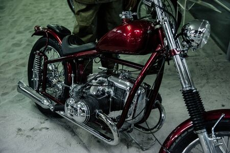 SINSHEIM, GERMANY - OCTOBER 16, 2018: Technik Museum. Red luxury classic motorcycle with person stands behind. Cropped photo.