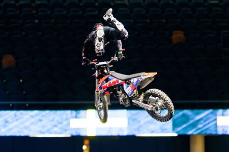 Milan, Italy - 2021 11 27: Eicma Milano Bike Expo Free Style motocross figures tricks. High quality photo