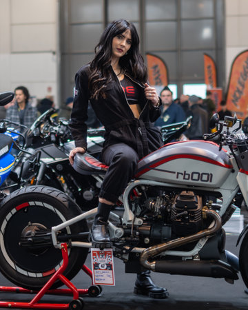 Verona, Italy:2025 01 24 MBE Motor Bike Expo MotorBike Event brunette girl on a motorbike. High quality photo