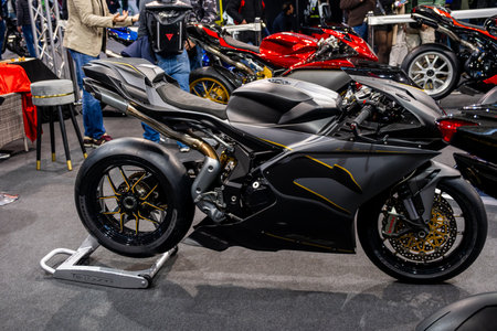 Verona, Italy : 2025 01 24 MBE Motor Bike Expo Custom Motorbike and Custom Muscle Car Event MV Agusta F4: Italian Superbike on Display Tamburini desing. High quality photo