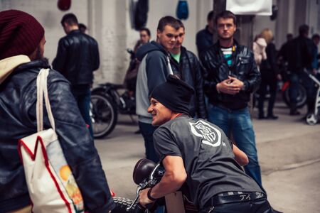 Belarus, Minsk, may 17, 2015, Oktyabrskaya street, biker festival. close up. a group of bikers on a city street