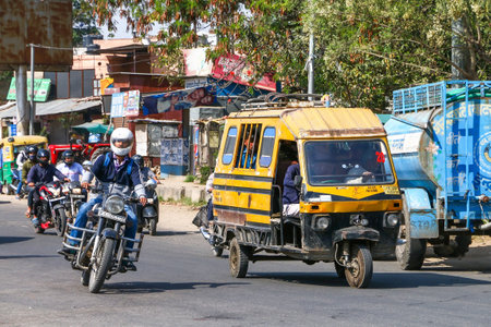 Jaipur, India - March 2, 2022: Auto rickshaw Vikram and many motorcycles in a city street.