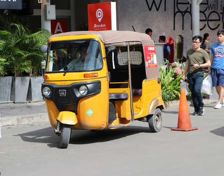 Phnom Penh, Cambodia, August 17, 2019 : Tuk Tuk or Taxi tricycle in yellow color on the road, Lifestyle of traffic in Phnom Penh. It is a three-wheeled motorized vehicle used as a taxi.