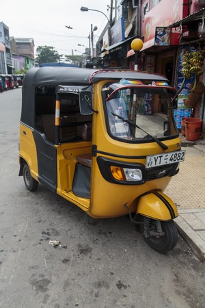 COLOMBO, SRI LANKA - JANUARY 18, 2014: Auto rickshaw or tuk-tuk on the street of Colombo. Most tuk-tuks in Sri Lanka are a slightly modified Indian Bajaj model, imported from India.