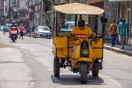 HAVANA, CUBA - December 08.2018: Typical Cuban motorbike taxis are known as Coco taxi in Havana, Cuba.