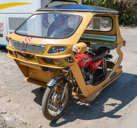 Puerto Princesa, Palawan, Philippines - March 3, 2019: Street view. Yellow taxi motor-tricycle parked in street.