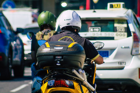Seville Spain September 22, 2021 People rolling with a motorcycle in the streets of Seville, an emblematic city and the capital of the region of Andalusia, in the south of Spain