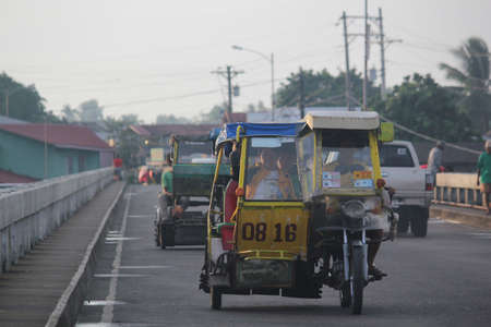 Surigao del Sur, Philippines- August 2014: Street scene early morning in Tandag City, Surigao del Sur, with tricycles improvised motorcycles with side cars) on the road.