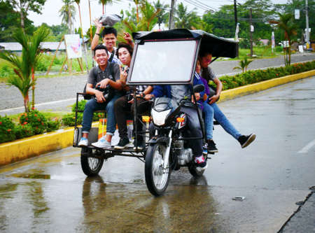 TAGUM CITY, PHILIPPINES—MARCH 2016: Passengers riding a motorcycle with a sidecar pose for the camera while driving along a wet street in Tagum City.