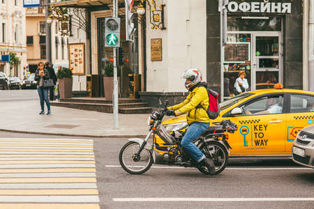 Moscow, Russia - JULY 7, 2017: Motorcycle racer in yellow jacket, protective helmet on motorcycle waiting for a green light on a pedestrian crossing against the background of a yellow taxi