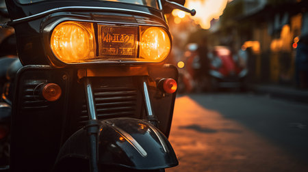 rickshaw taxi parked on the side of the road at sunset, captured in a super close-up shot. this low angle photograph showcases the intricate details of the vehicle. shot on the high-resolution sony alpha a7 mark iv, the image is incredibly realistic and perfect for high-quality viewing, even in 8k resolution. ai generated