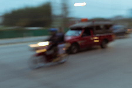 car and motorcycle driving on road with traffic jam in the city, abstract blurred background