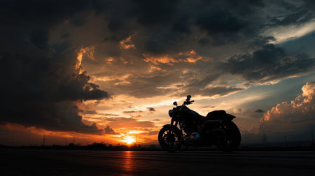 A stunning silhouette of a motorcycle against a vibrant sunset sky filled with rolling clouds and distant power lines, capturing the essence of adventure and freedom.