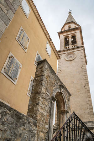 View of bell tower of the Church of St Ivan, Budva, old town, Montenegro