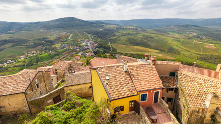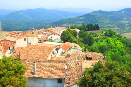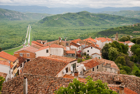 view of the house with red roofs and the valley from a high point. The town of Motovun, Croatia