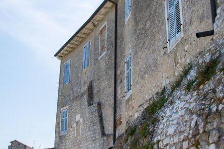 Facade of an old ruined house on a stone wall in the old town of Porec (Parenzo), in the Istrian Peninsula, Croatia