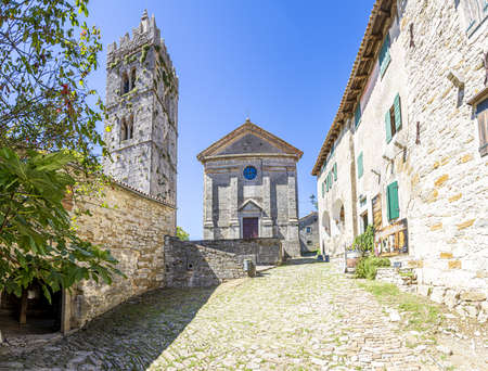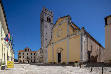 Panorama over the central square of Motovun with St. Stephen's church and city gate during the day in summer