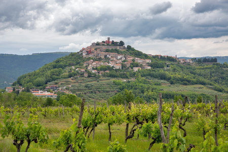 Medieval hilltop town of Motovun perched on hill surrounded by lush green vineyards in Istrian countryside under dramatic cloudy sky, showcasing traditional Croatian architecture and wine region.