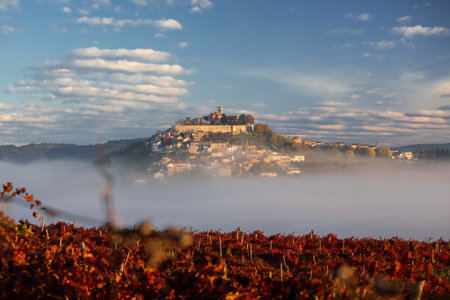 The Croatian medieval hill village of Motovun in central Istria. The inner village is surrounded by walls dating back to the 13th century, autumn vineyards in foreground.