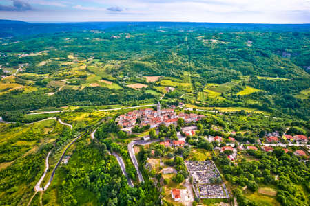 Idyllic hill town of Draguc in green landscape view, inland Istria, Croatia