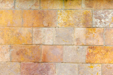 Brick wall with a yellow and brown color. The wall is made of bricks and has a rough texture