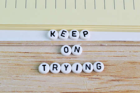 Notebook and alphabet beads with text KEEP ON TRYING
