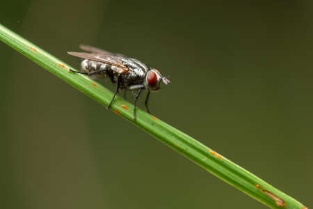 Common fly on a green blade of grass, macro. A small common housefly insect sitting on a green blade of grass in the sun, macro photo.