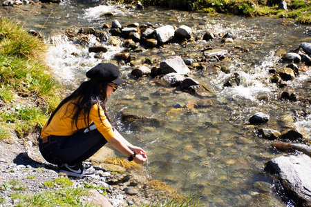 Travelers thai woman travel take photo play water creek at Ferner Garten Snowpark Kaunertal or Kaunertaler Gletscher in Kaunertal village alps valley in Landeck on September 20, 2019 in Tyrol, Austria