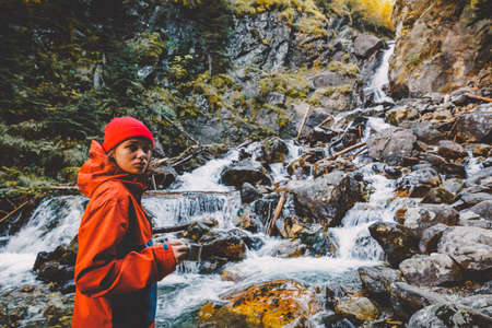 Octomber 07, 2019. Arkhyz, Russia. Hiker young woman with hot drink cup near a mountain river.