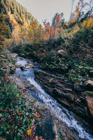 Atmospheric landscape with big stones in mountain river. Powerful water stream among boulders in mountain creek with rapids. Fast flow among rocks in highland brook. Beautiful scenery with small river