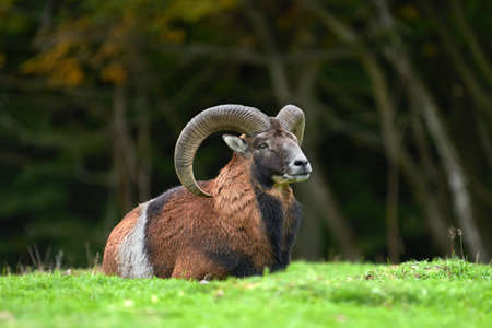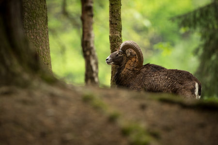 Mouflon, Ovis orientalis, portrait of mammal with big horns, Prague, Czech Republic. Wildlife scene form nature. Animal behavior in forest. Muflon with big horns on the head, in the forest.