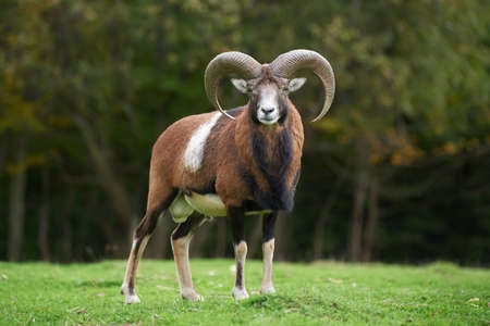 Mouflon ram standing in forest with foliage in autumn