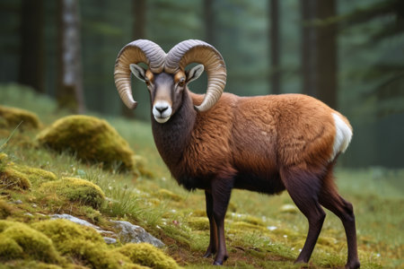 Mouflon ram on hillside in forest.