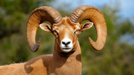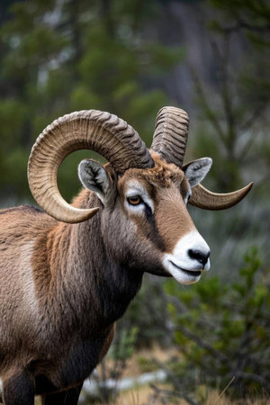A striking close-up of a ram showcasing its impressive curved horns and expressive eyes, set against a blurred natural background that highlights its majestic presence.