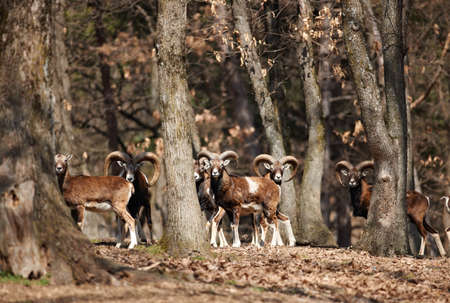 Flock of male European mouflons in oak forest