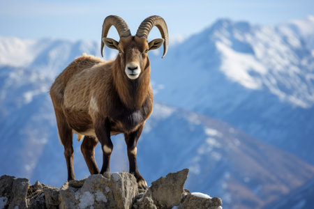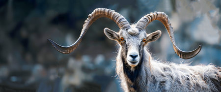 Majestic portrait of a Markhor goat an endangered species native to the mountainous regions of Central Asia showcasing its impressive spiral shaped horns against a backdrop of rugged rocky terrain