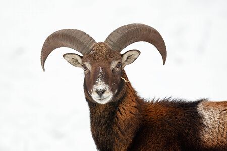 Close-up of curious young mouflon, ovis musimon, looking to camera in wintertime with snow in background. Horizontal portrait of wild mammal with curved horns in cold weather.