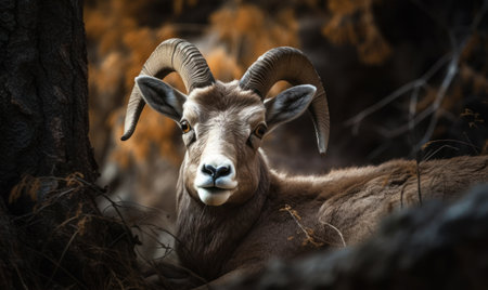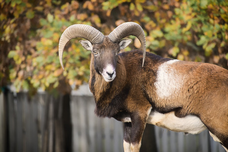 Moufflon next to the tree in fall autumn colours and leaves