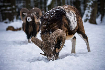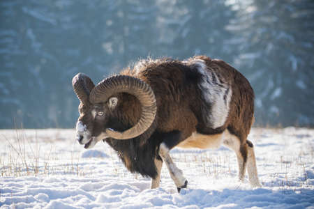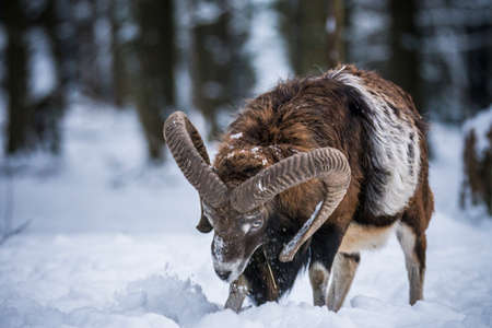 Mouflon walking in snowy forest in wintertime nature
