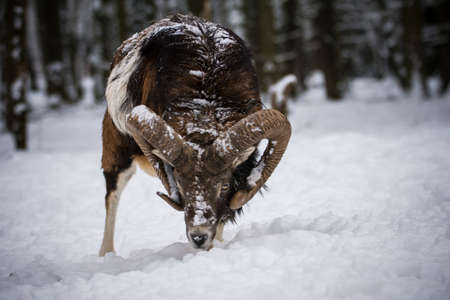 Mouflon, Ovis orientalis, horned animal in snow nature habitat. Close-up portrait of mammal with big horn, Czech Republic. Cold snowy tree vegetation, white nature. Snowy winter in forest.