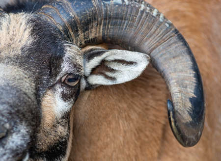Male Cyprus mouflon with big horns. Head shot close up, soft background, copy space